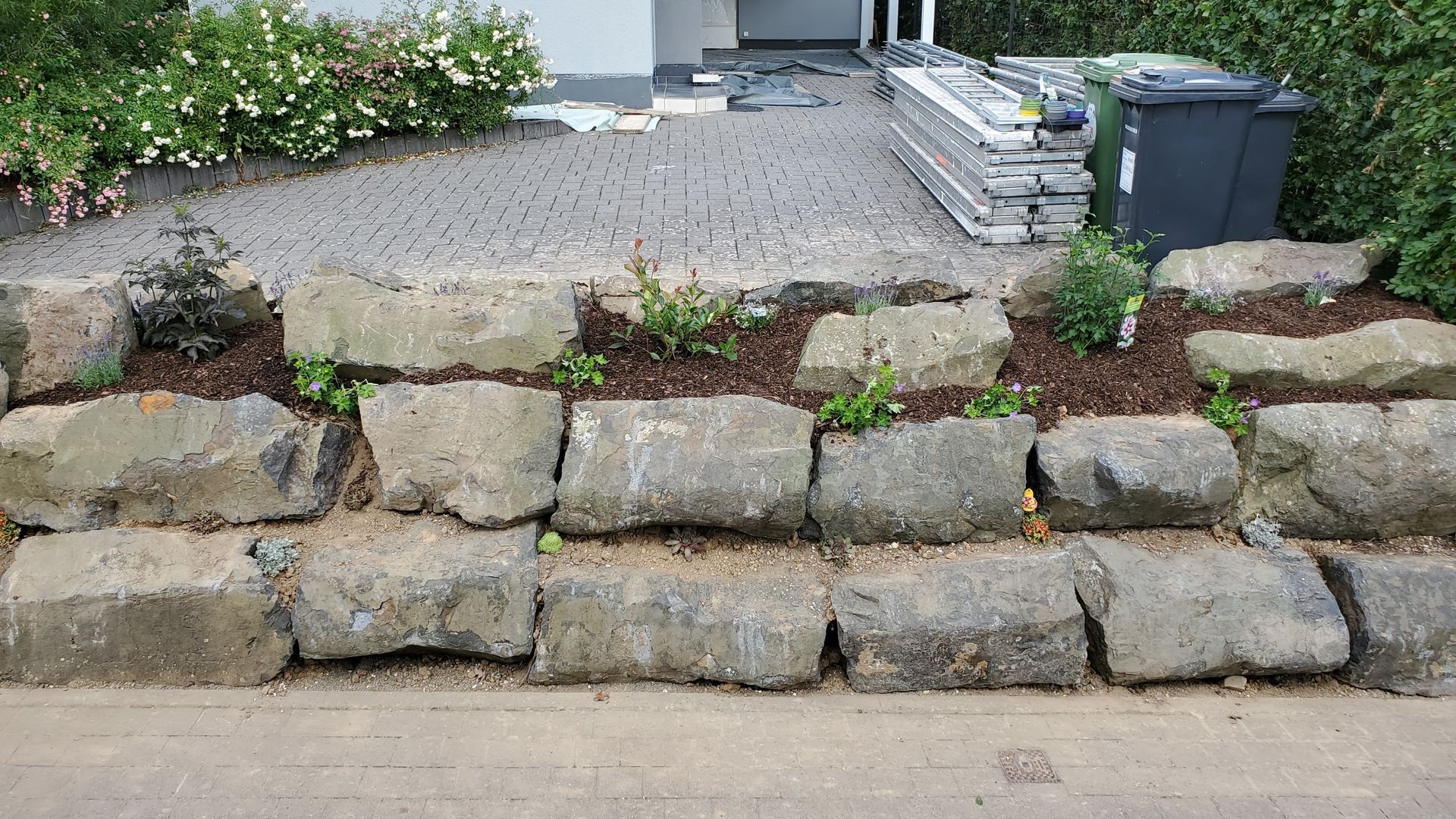 Bild 3: Böschung abfangen mit Basaltsäulen als Trockenmauer und Bepflanzung
