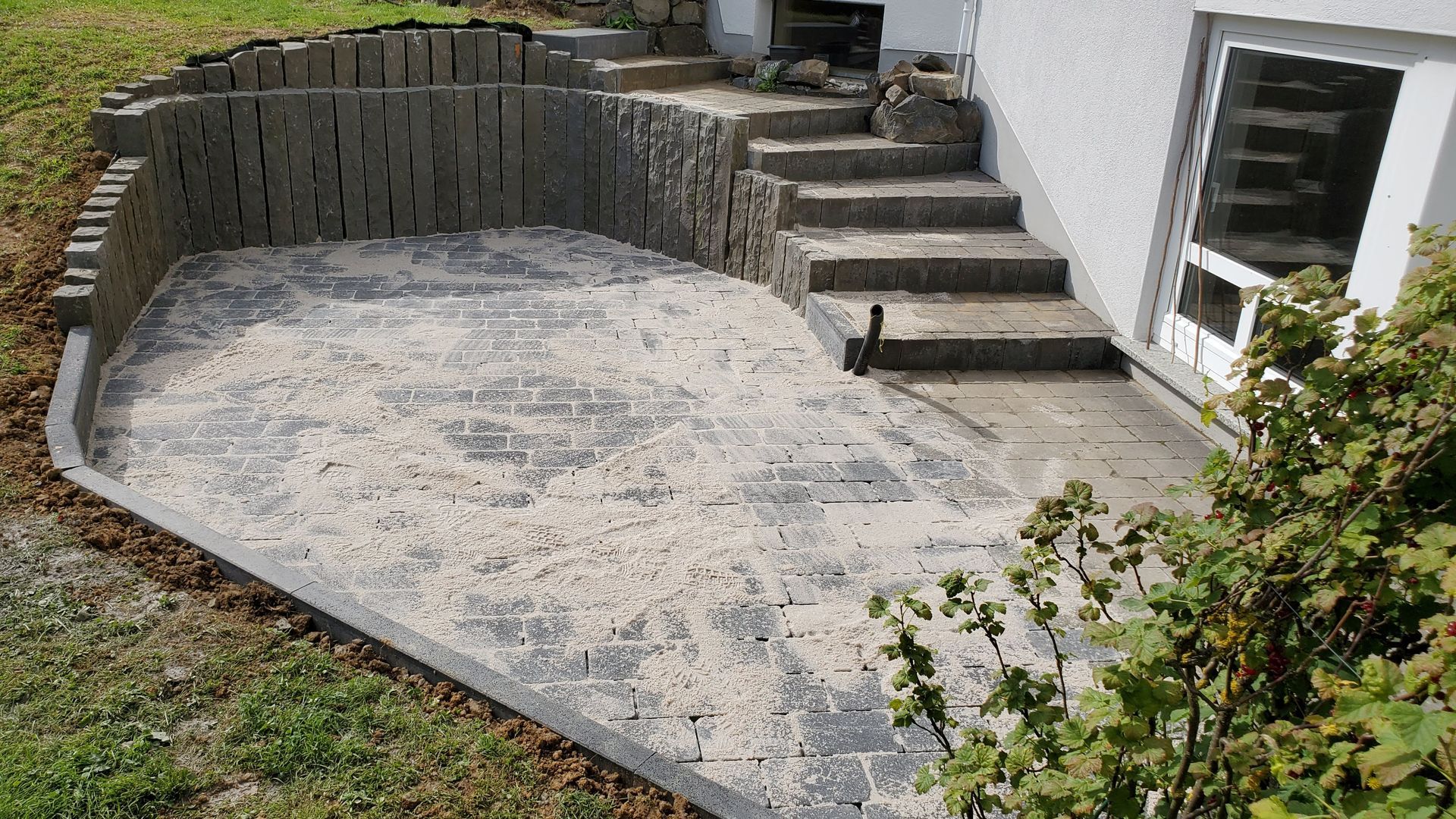 Bild 1: Sitzplatz aus Natursteinpflaster, Beet eingefasst mit Basaltsäulen